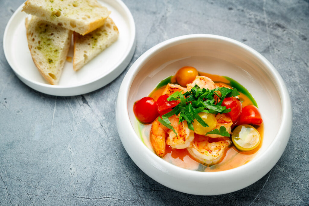 KREVETID, VÕIKASTE KÜÜSLAUGU JA TSILLIGA, KIRSSTOMAT, PETERSELL, CIABATTA